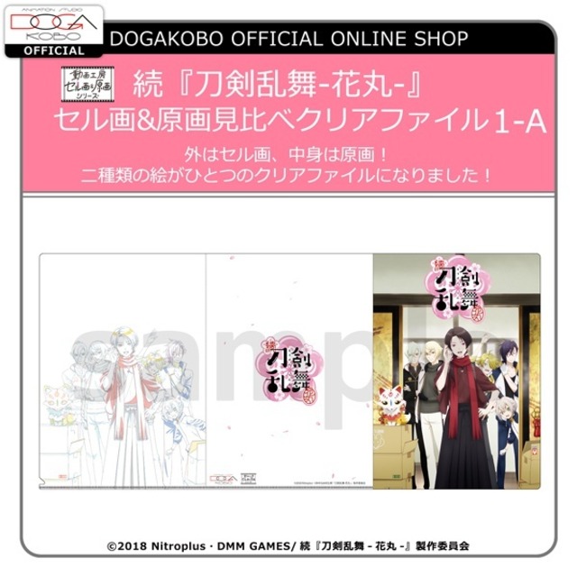 アニメーション制作会社動画工房 厳選イラスト収録! アニメ続「刀剣乱舞-花丸-」のアニメーション制作を担当している 動画工房自ら手掛けるグッズ! セル画と原画を交互に見れるように2層構造にした特製クリアファイルです! 価格:700円(+税) メーカー:株式会社動画工房 【仕様】 ■サイズ:A4 ■素材:クリアファイル(二重構造) 【1枚目/外側を通常のセル画、2枚目/内側にその原画。二重でイラストを見比べて楽しめる仕様。】 印刷:4色フルカラー印刷 素材:プラスティック